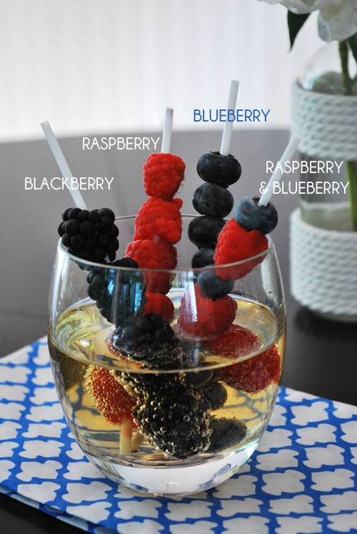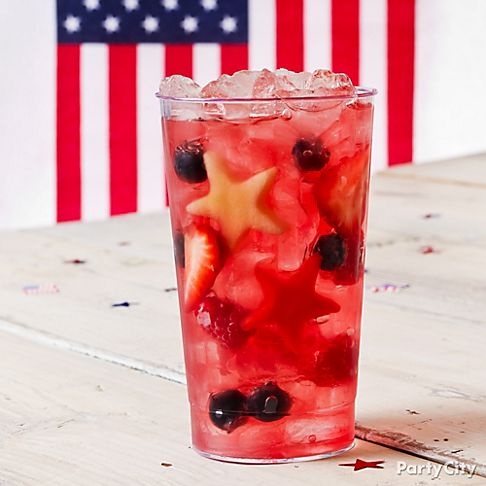 This will work for any tropical cocktail or refreshment. Start with any wooden or plastic skewer. Then choose colored fruit for the occasion. Skewer the fruit and place in each glass. Almost any grocery store will have raspberries and blueberries for your red and blue if you don’t already have some in your garden. Red apples are a good option as well as they offer both red and white. It is also ok to simply add some loose fruit to the drinks. This would be a great way to compliment the skewer and to add other fruit to the mix; such as pomegranate, which is hard to skewer.