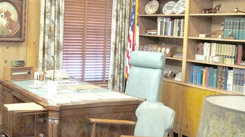 LBJ’s bedroom has a massage table for his back problems, which is also the place he had a massive heart attack and died in 1973. Because he used to have visitors in the master bedroom, Lady Bird got tired of pulling the covers up over her head, so they built separate rooms. Their clothing still fills the closets. (Pamela O’Meara/Review)