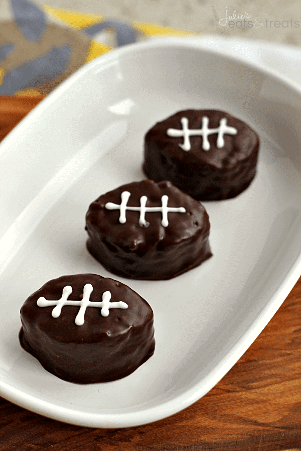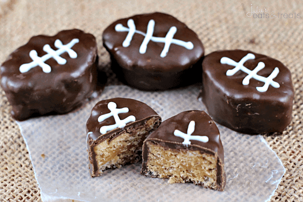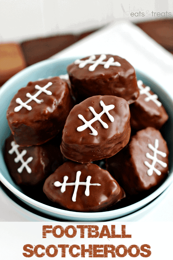 These would be great for your game day party. This football scotcheroos recipe is from Julie Eats and Treats.com. Our grandkids thought they were awesome even thought they don’t seem to care much for football.