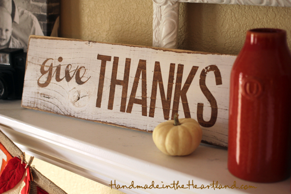 I think Thanksgiving is often forgotten, but it’s my favorite holiday of the year. I love so much about it, including the reminder to be grateful for all the things we enjoy. As my extended family grows and children are added, we’re gathering less at Christmas which makes Thanksgiving even more special to me. But we don’t have a lot of Thanksgiving-specific decor so I love this Give Thanks board from the lovely Angela at Handmade in the Heartland. She actually made a garland, pillow, and board (and the pillow is what drew me in), but the board is what I’ve chosen to make today.