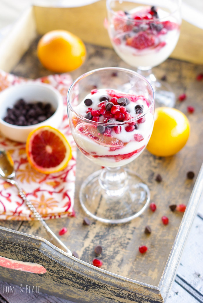 Stick to plain or vanilla traditional or Greek yogurt for this dessert. With the addition of dark chocolate chips, syrupy sweet blood oranges and juicy pomegranate seeds there really is no need for extra sweetness.