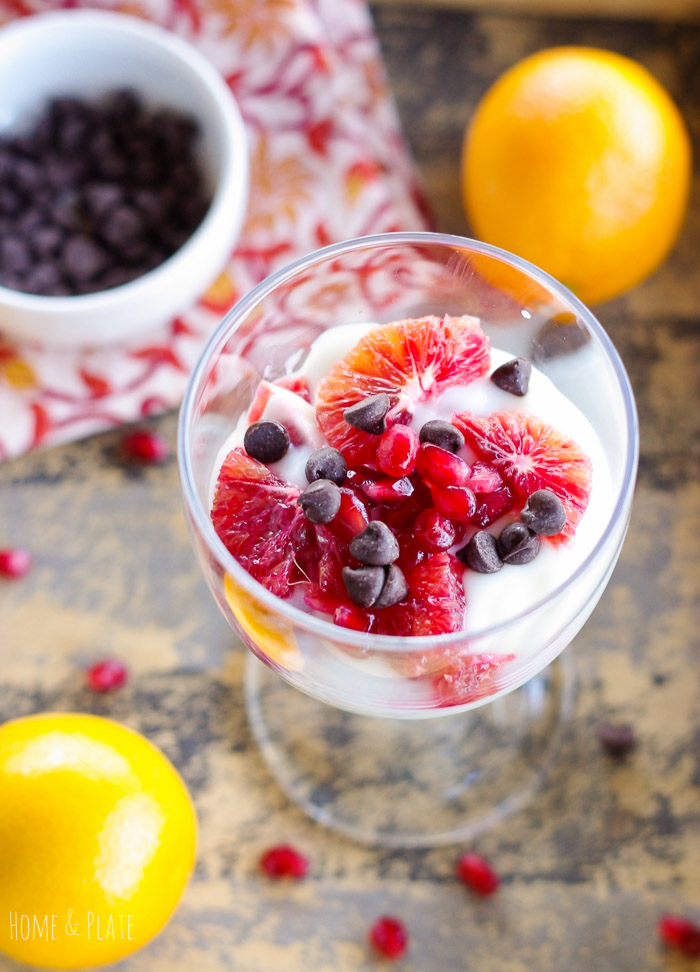 Stick to plain or vanilla traditional or Greek yogurt for this dessert. With the addition of dark chocolate chips, syrupy sweet blood oranges and juicy pomegranate seeds there really is no need for extra sweetness.