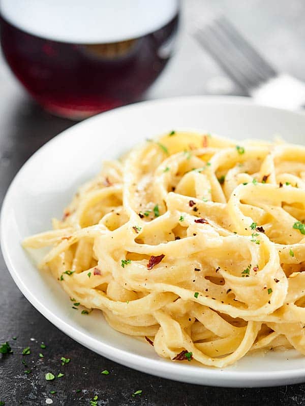This Alfredo Sauce is lightened up with skim milk and your choice of broth (chicken or veggie for flava), but is kept creamy with the help of non fat plain greek yogurt, and just a teeny tiny touch of parmesan cheese.