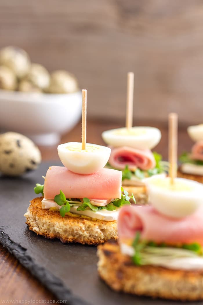 These bite size quail egg and goat cheese pinchos bites are perfect for parties or family gatherings!
