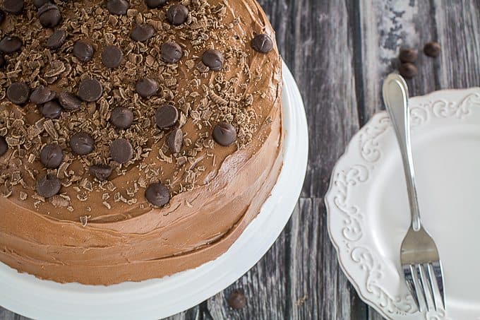 This cake is all of the things I’ve been looking for in my life, wrapped up in chocolate cream cheese frosting and topped with chocolate chips. Because sometimes I’m just in the mood for chocolate! It’s super moist, rich, and definitely perfect for the next birthday cake on your schedule.