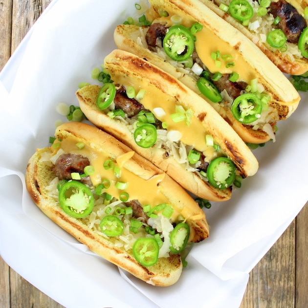 These meaty links are gently simmered in a pot of butter, onions, beer and apples. It makes my mouth water just thinking about all that goodness. Then they’re finished on the grill, topped with cheesy beer sauce, sauerkraut, Sriracha ketchup, scallions, and jalapenos.