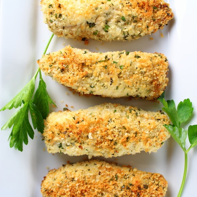 Parmesan Baked Chicken Strips Recipe - golden, tender & juicy. Coated in a cheesy crust w/ a marinara dipping sauce, the whole family will love these!