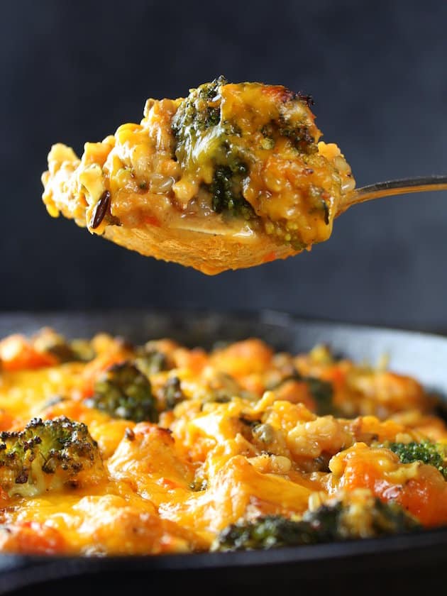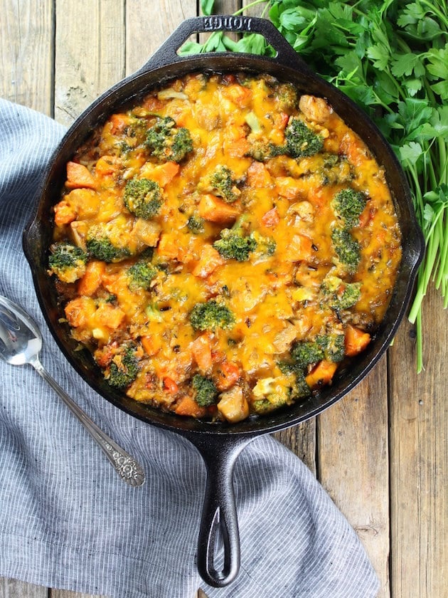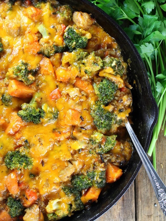 Chicken Skillet with Sweet Potatoes and Wild Rice - A hearty, comforting one-pan meal loaded with broccoli, sweet potatoes, wild rice, and chicken!