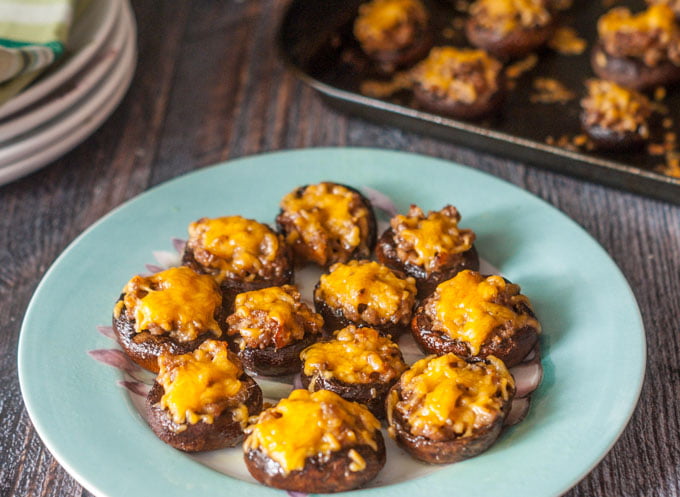 First off, I wish this photos were better, but I decided to give these a try right before kickoff last Sunday and well I rushed through the photos. So the idea behind this easy appetizer is to stuff a mushroom with a combination of sausage and cheese. I made a big batch and they all went! These low carb sausage stuffed mushrooms would be great to take to or serve at a party when you wanted to stay on a low carb diet but still wanted to make something everyone would like. They are only 1g net carbs each!