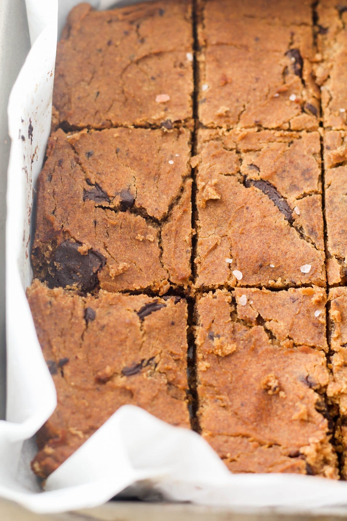 Clearly, these blondies are not cookie dough, although I did eat my fair share of the batter so if you want cookie dough, just don’t bake them. Thankfully, some of my batter ended up in the pan because these came out so moist, almost fudgy, salty sweet I don’t know what to do with myself. I actually ground a whole dark chocolate bar and added that to the food processor too, I didn’t want to mess with chocolate chips I wanted the REAL thing with GIANT chunks of chocolate.