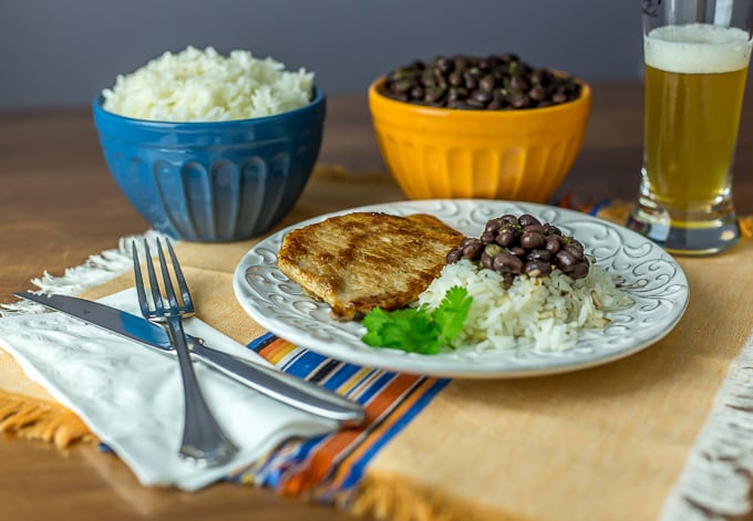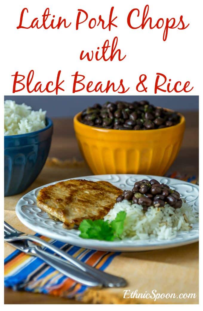 Rice, Black Beans and Pork Chops: a typical Latin American or Caribbean meal that is rich in flavors, and also nutritious.