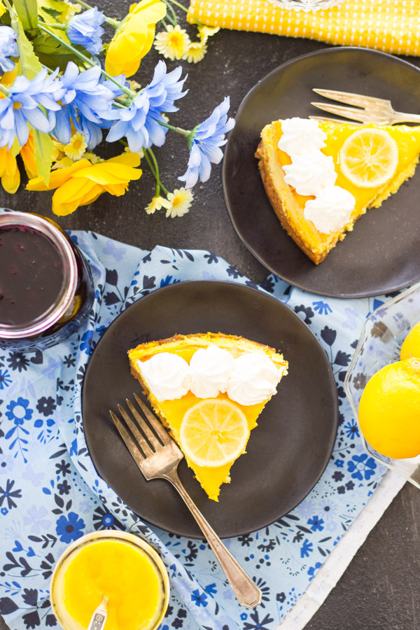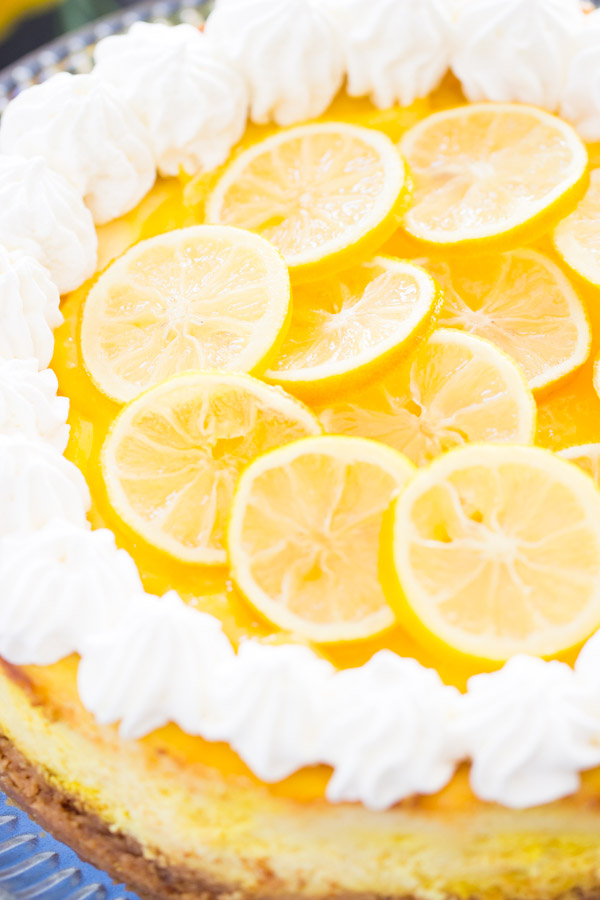 It’s so so creamy, so so tangy, and so so lemony! It has tang and zest from top to bottom. Crust – check. Cheesecake – check. Lemon curd – check. Candied lemon slices – check. Lemon, lemon, and more lemon.