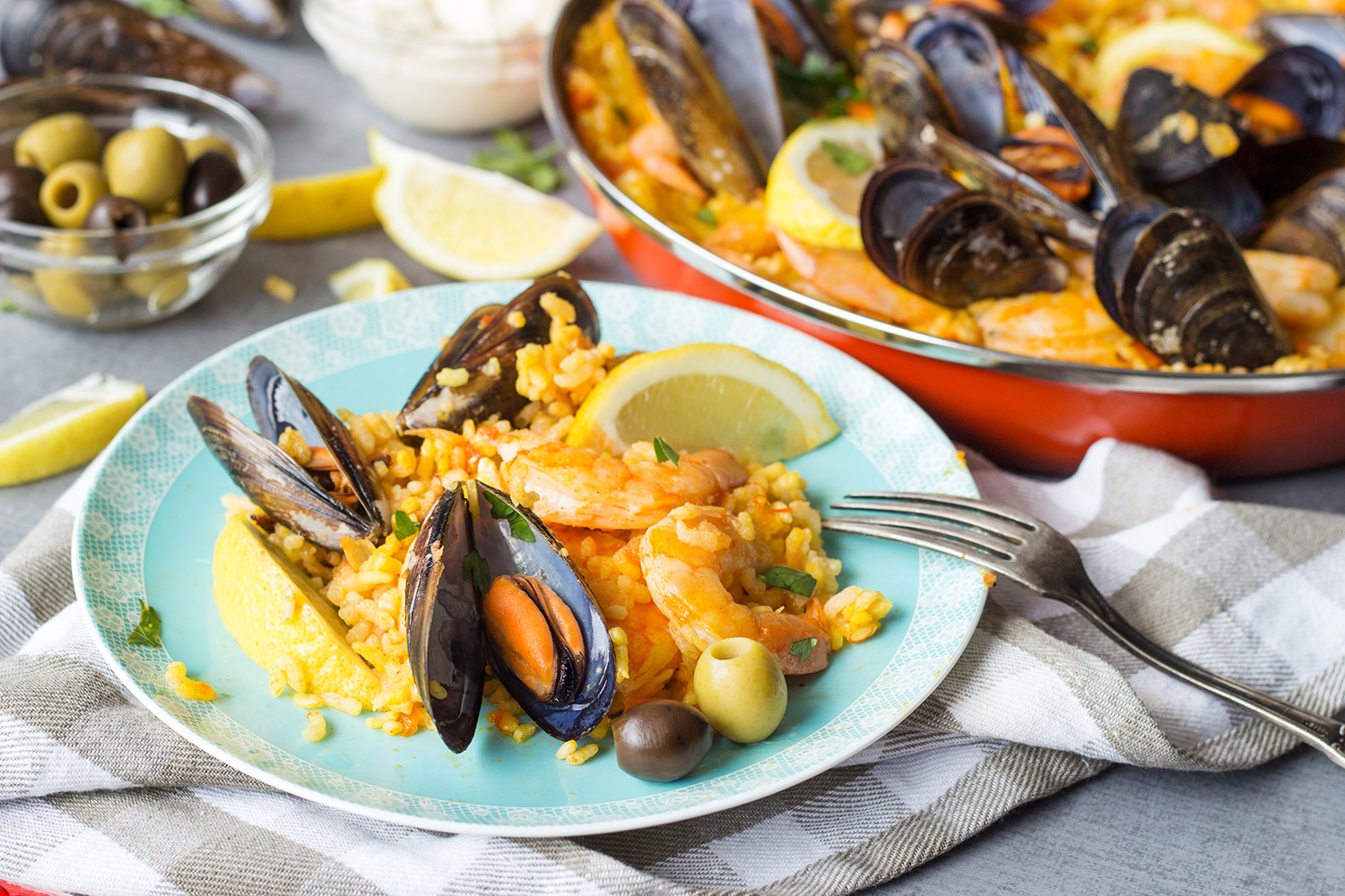There are a few ways to cook the seafood paella. You can either leave your seafood with shells on and use your hands when eating it or clean everything before the cooking process. It’s heavenly both ways!