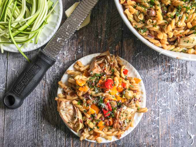 Along time ago I remember my aunt making a delicious balsamic pasta that was full of garlic and olives and …well I can’t remember anything else. I remember it was delicious but I was too lazy to call her for the recipe so I just made up my own! Boy was this good. I used a lot of pantry ingredients like artichokes and greek olives as well as balsamic vinegar and apricot jam. Yes apricot jam. I’m enamored with apricot jam lately. I used it on my poblano grilled cheese and in an upcoming post as well. Anyway, I am very please how my artichoke & olives balsamic pasta came out and I will be making this again soon!