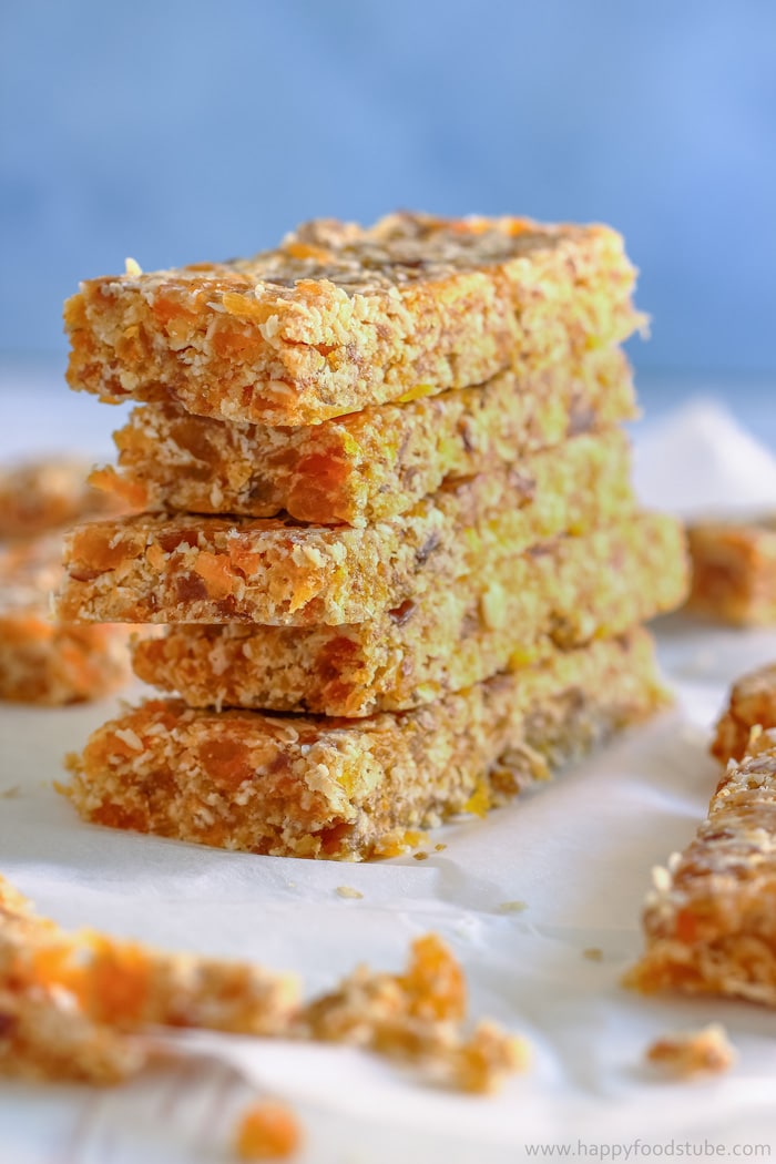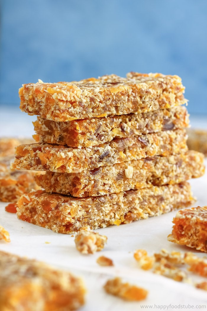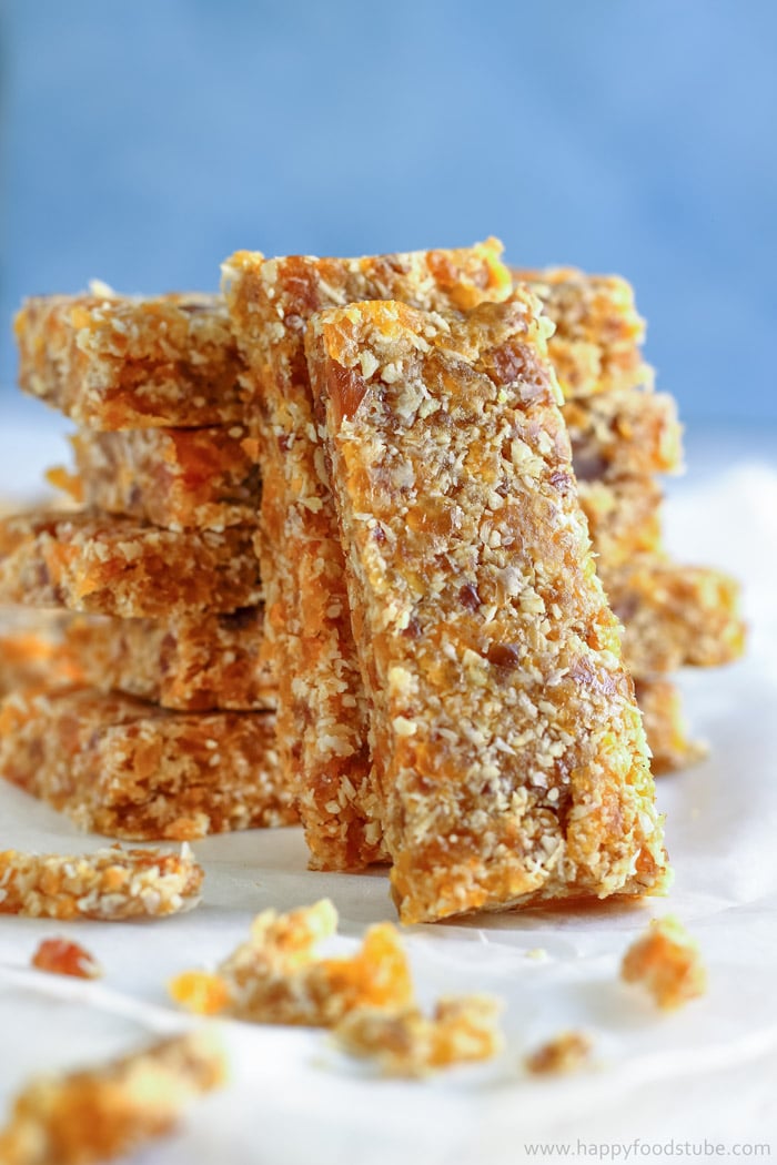 Homemade healthy no bake energy bars. These chewy & naturally sweet bars are made with dried dates and apricots. Vegan, gluten free & nut free recipe.