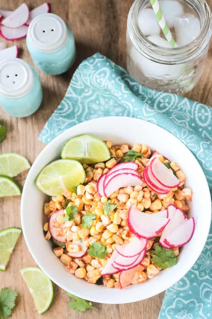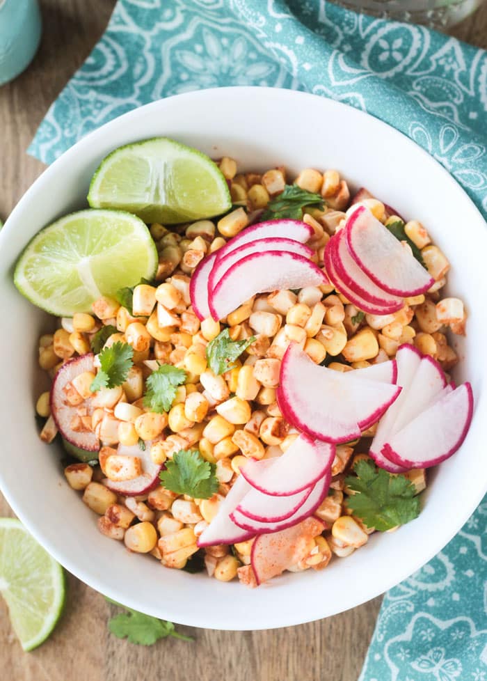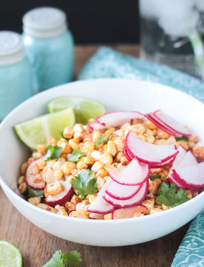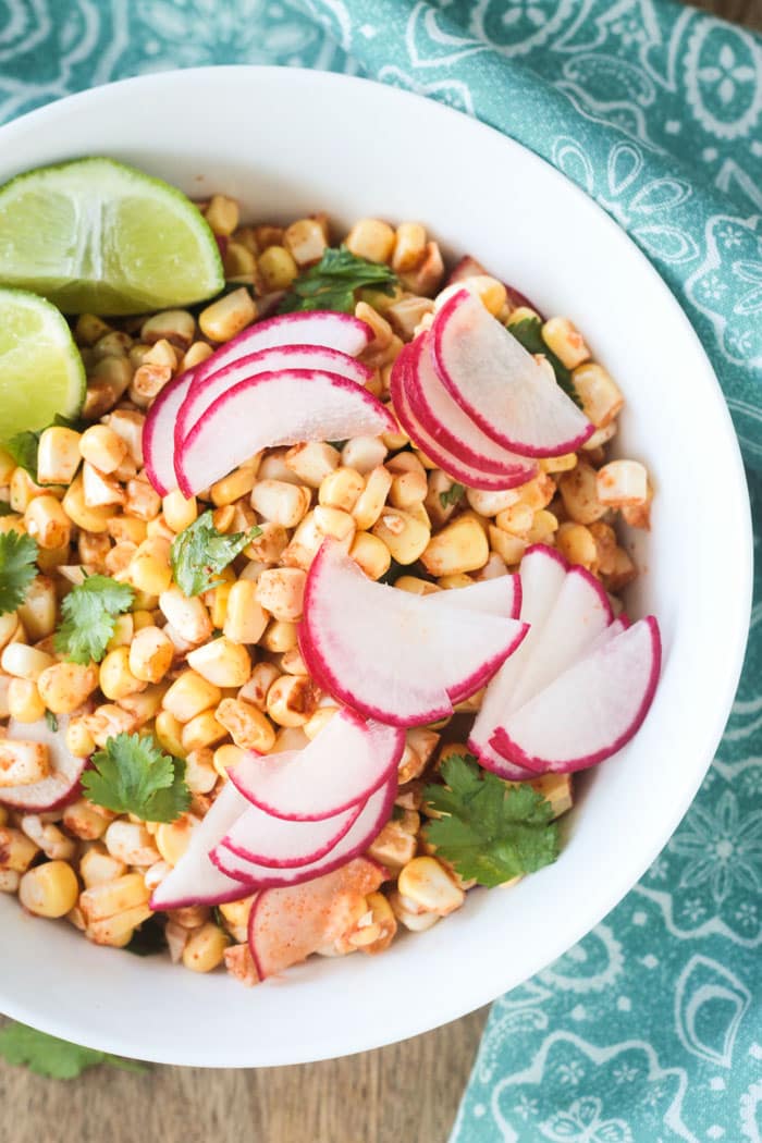 Fresh sweet corn is at it’s finest right now. I’ve mentioned before and I’ll say it again – we are so lucky to have an amazing farm just down the street. They have the best sweet corn and every summer I look forward to their announcement saying it’s ready! Well, it’s ready, and we’ve been eating corn on the cob with almost every meal. Can’t. Get. Enough. And watching little kids eat corn on the cob is one of the funniest things ever. Seriously. It’s bigger than their little faces and they are covered in corn from chin to forehead almost immediately. Anyway, did you know that fresh sweet corn is delicious raw? Well, it is. And that’s how I use it in this surprisingly simple, yet flavorful Raw Corn and Radish Salad.
