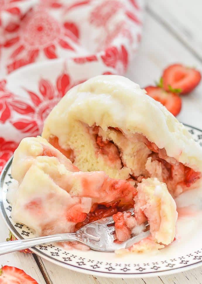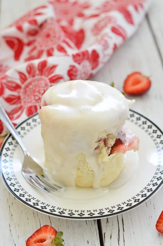 This Strawberry Sweet Roll Mug Cake is big, soft and squidgy and stuffed with sweet, juicy, fresh strawberries. It takes only about 5 minutes to prepare and a little over 1 minute to cook in the microwave and it is completely yeast free.