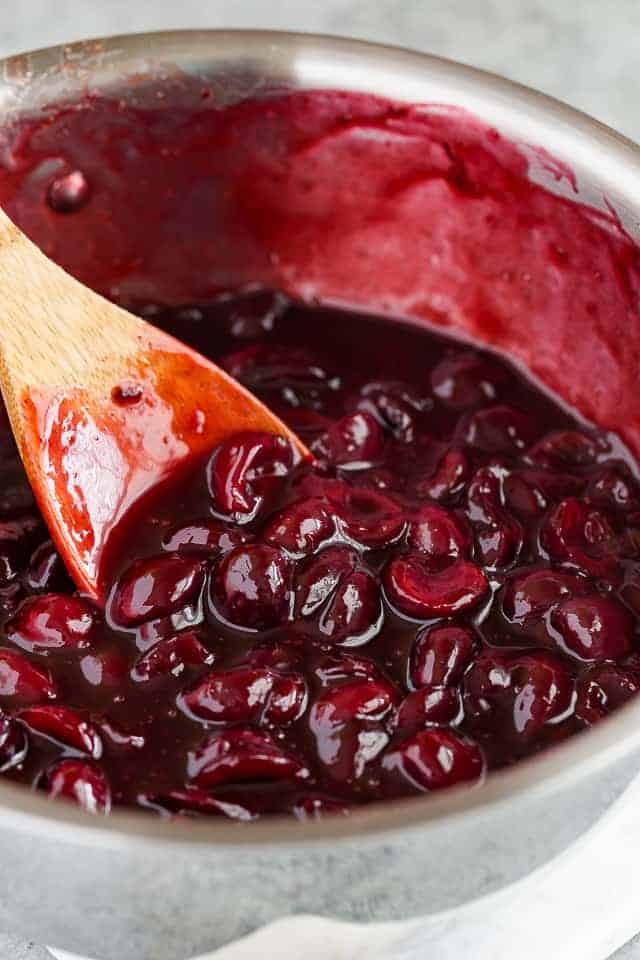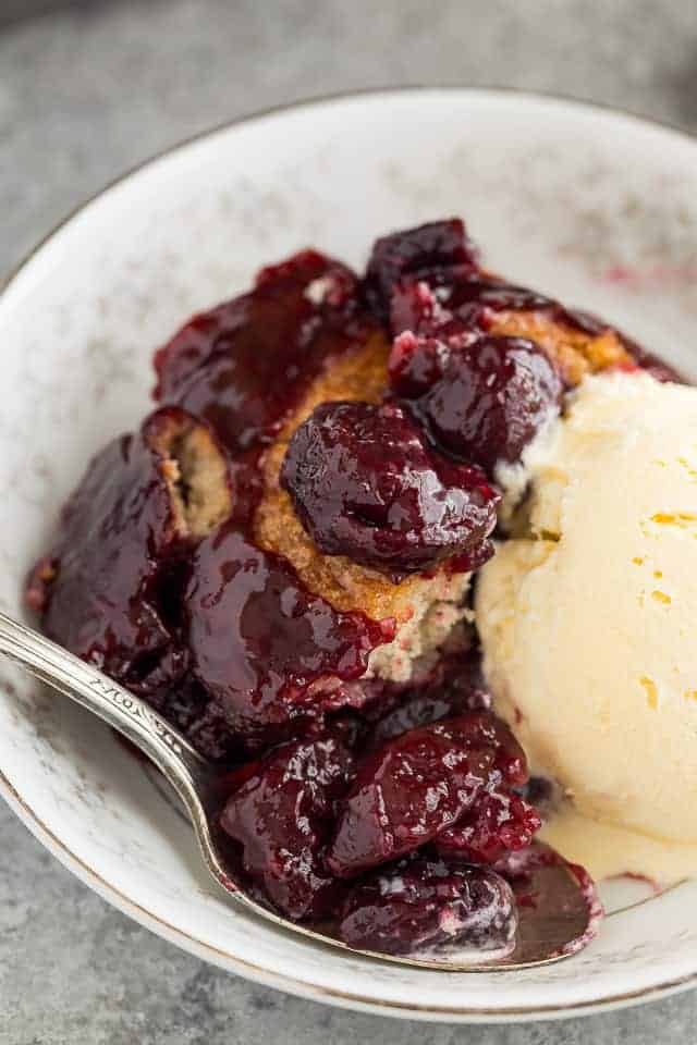 The dough is tender and turns a gorgeous golden brown during baking. This cobbler starts by cooking the cherries on the stove top until the juices have thickened. Then, it gets transferred to a baking pan and layered with the delight topping. After a few minutes in the oven, the cobbler is ready to be enjoyed warm with a scoop of vanilla ice cream.
