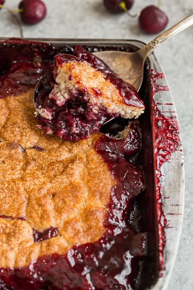 Visit Baked by an Introvert for the full recipe - Fresh Cherry Cobbler.