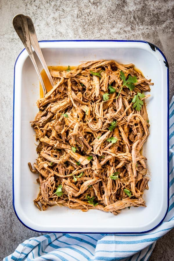 Then you can shred the meat with two forks and serve it up as tacos or however you like. You can, of course, brown it in a skillet, too. I’m just usually too lazy too harassed by hungry kids to bother.