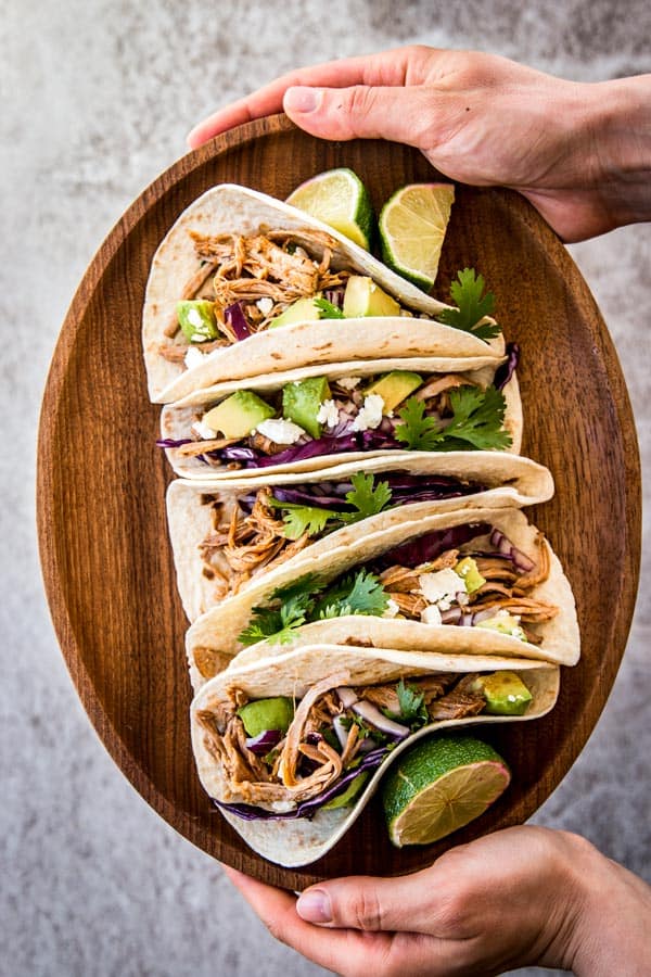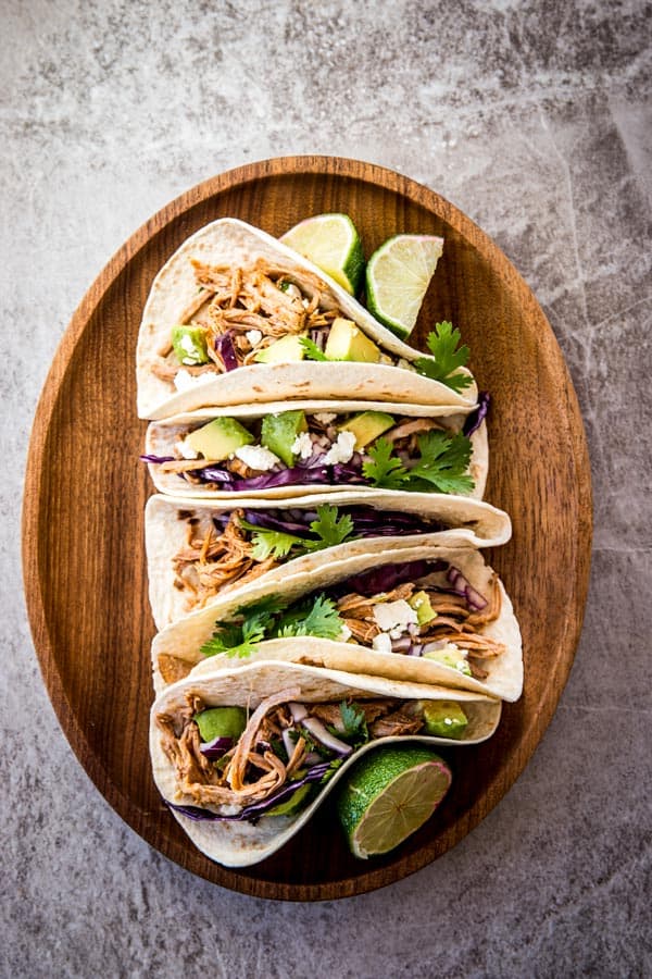 It is a fantastic way to have a satisfying meal on a busy weeknight, all you’ll have to do is pull out some taco shells, slice up some avocado and red onion, serve with lime wedges, crumbled cheese, cilantro and shredded red cabbage.