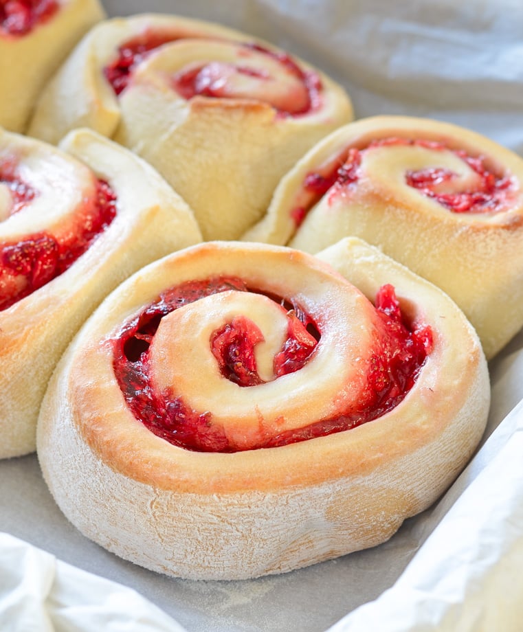 I absolutely adore cinnamon rolls but these Sticky Lemon Strawberry Sweet Rolls make such a refreshing, summery change. The jammy strawberry filling and the lemon frosting work so well together and although they are sweet, the sharpness of the lemon offsets it nicely. They are so good! And the smell when they are baking is incredible! I do wish smell-o-vision was a thing. Just imagine for one minute….That yeasty dough smell. Strawberries. Sweetly intoxicating. Even more so when they are bubbling away in a pan like at the start of this recipe. Lemons. Fresh, zingy and citrusy as you zest them. Then the smell of baking. Put it all together and, well, I just can’t get enough.