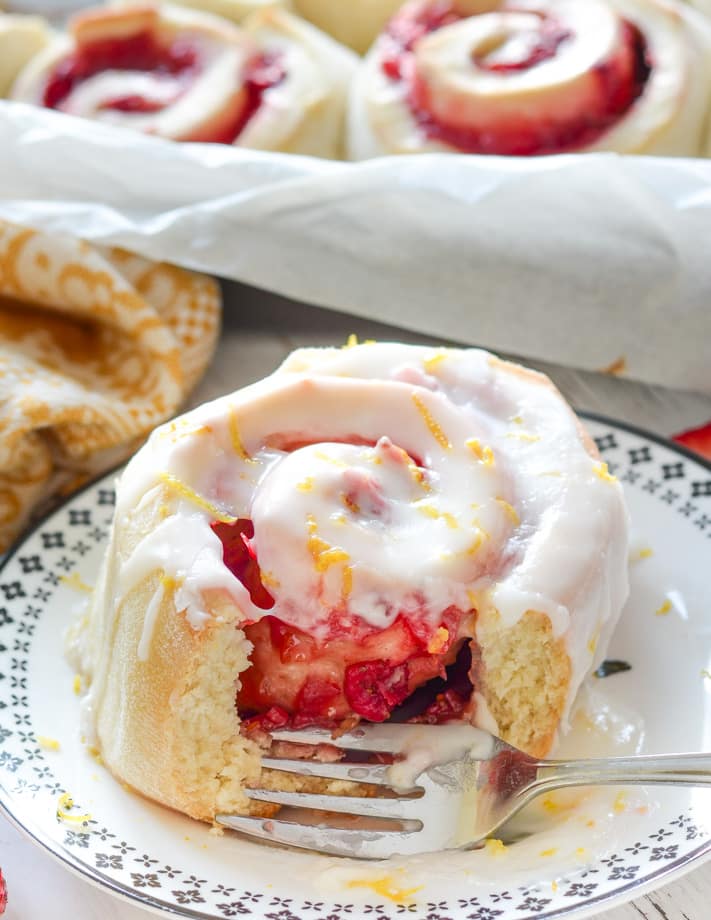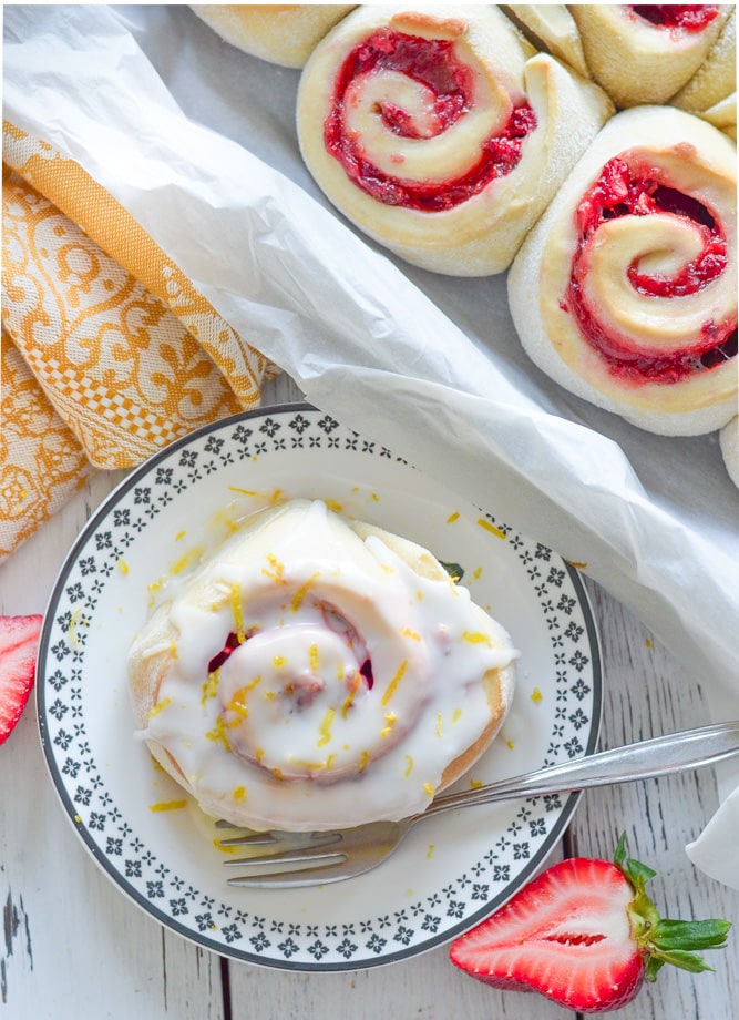 This Sticky Lemon Strawberry Sweet Rolls recipe is easy to make and downright decadent. Soft, fluffy, oozing with sticky, sweet strawberry filling & covered in swathes of zingy lemony frosting. And it’s ready in a little over 1 hour….Grab your rolling pin because it’s time to get baking!