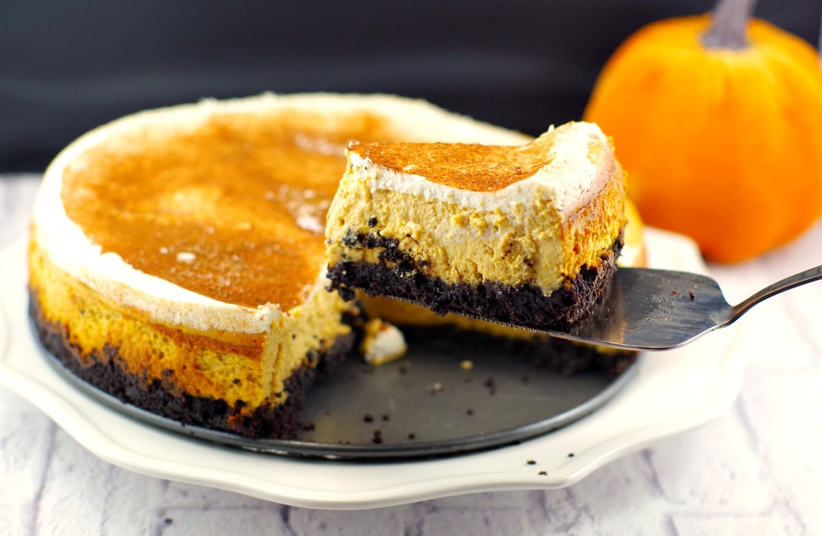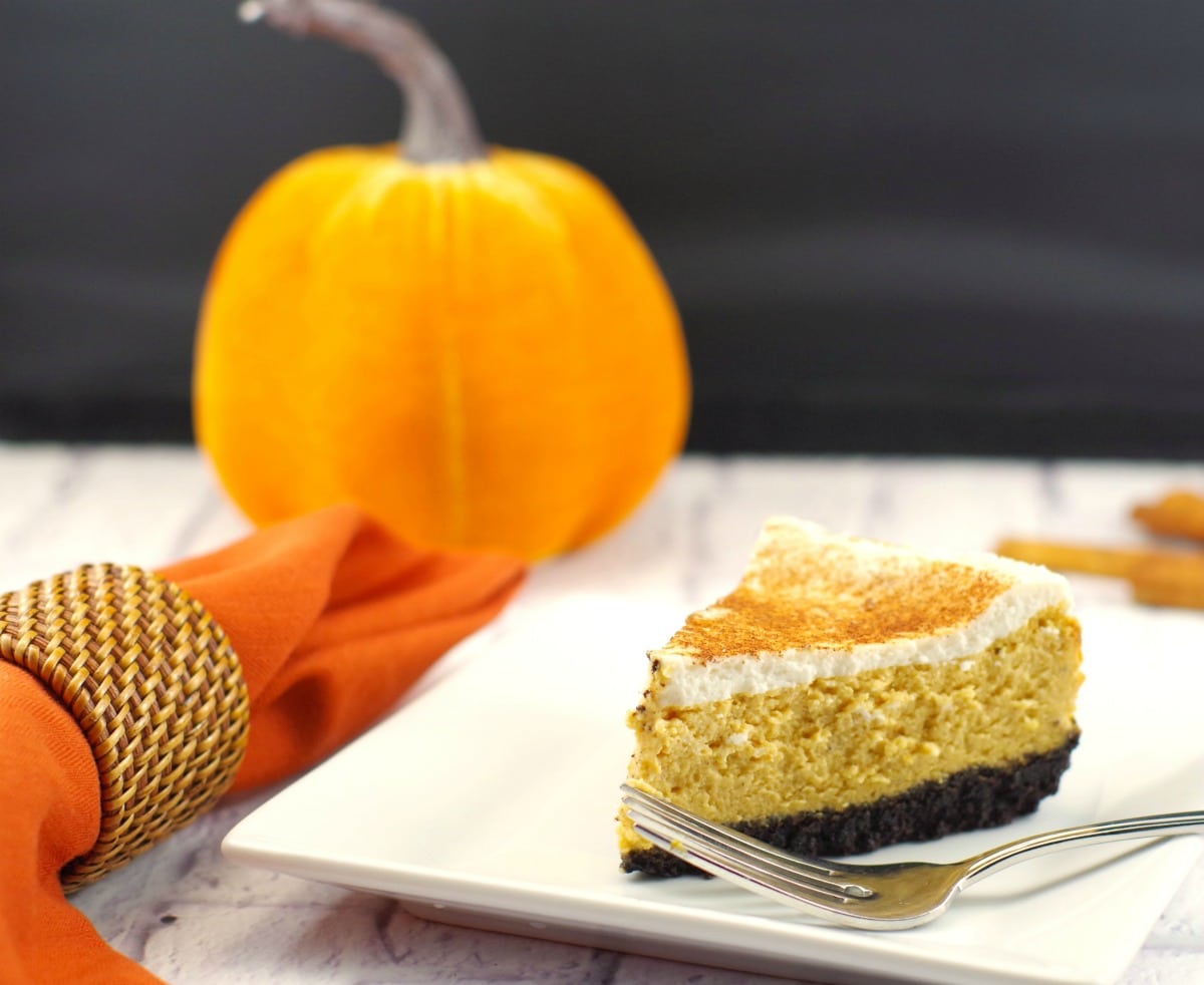 A light and delicious cheesecake made with pumpkin and a chocolatey oreo cookie crust. This skinny pumpkin cheesecake makes a great Thanksgiving dessert idea and is the perfect pumpkin pie alternative!